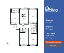 Прямая продажа от застройщика! Семейный жилой район класса Комфорт ПлюсПродаётся 4-к квартира номер 361 общей площадью 100.4 кв.м. на 23-м этаже 24 этажного дома. Отделка Whitebox.Особенности:- Квартира доступна к покупке в Trade-In.Квартира с предчистовой отделкой (White box). Вам не придётся заниматься черновыми трудоёмкими работами, а чистовую отделку и дизайн сделаете по своему вкусу.Расположение комплекса: Сочетание свободного перемещения по внутреннней территории без машин и ощущения абсолютной безопасности благодаря надежным ограждениям - вот что отличает ЖК Южная Битца. На территории комплекса созданы все условия как для активного образа жизни, так и для спокойного времяпрепровождения. Свободно перемещайтесь по внутренней территории в безбарьерной среде! Продуманное зонирование во дворах позволяет отделить тихие зоны для родителей со спящими младенцами и тех, кто хочет почитать на свежем воздухе, от шумных игровых зон. Игровые зоны учитывают возраст детей. Площадки для детей старшего возраста вынесены за пределы дворов. Ощущение уютного дома должно начинаться с подъезда. Мы постарались предусмотреть все нюансы, чтобы наши лифты отвечали самым строгим современным требованиям. А наличие кладовых позволит вам поддерживать идеальный порядок и уют в вашей квартире!Транспортная доступность:В 3 км от МКАД в нескольких минутах езды до трех станций метро: Аннино, Бульвар Дмитрия Донского, улица Старокочаловская и станции МЦД2 - жд Бутово.Внутренняя инфраструктура:Для жителей жилого района ''Южная Битца'' доступна развитая инфраструктура близлежащих московских районов Чертаново, Южное, Бирюлёво Западное, Северное Бутово и Южное Бутово. Множество образовательных учреждений, объекты здравоохранения, торговые и развлекательные центры, кинотеатры, кафе, рестораны, парки. Цены указаны с учетом скидки.