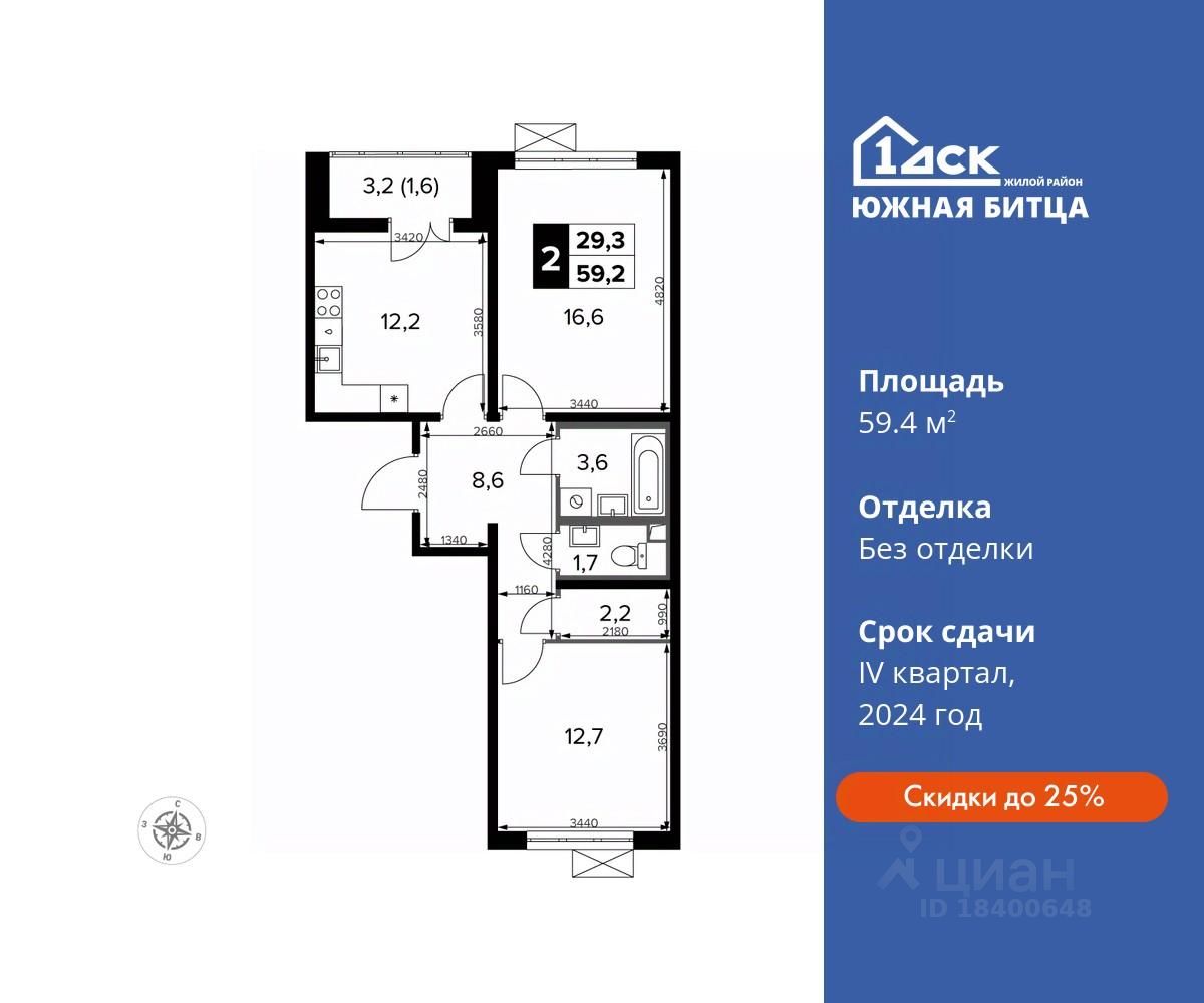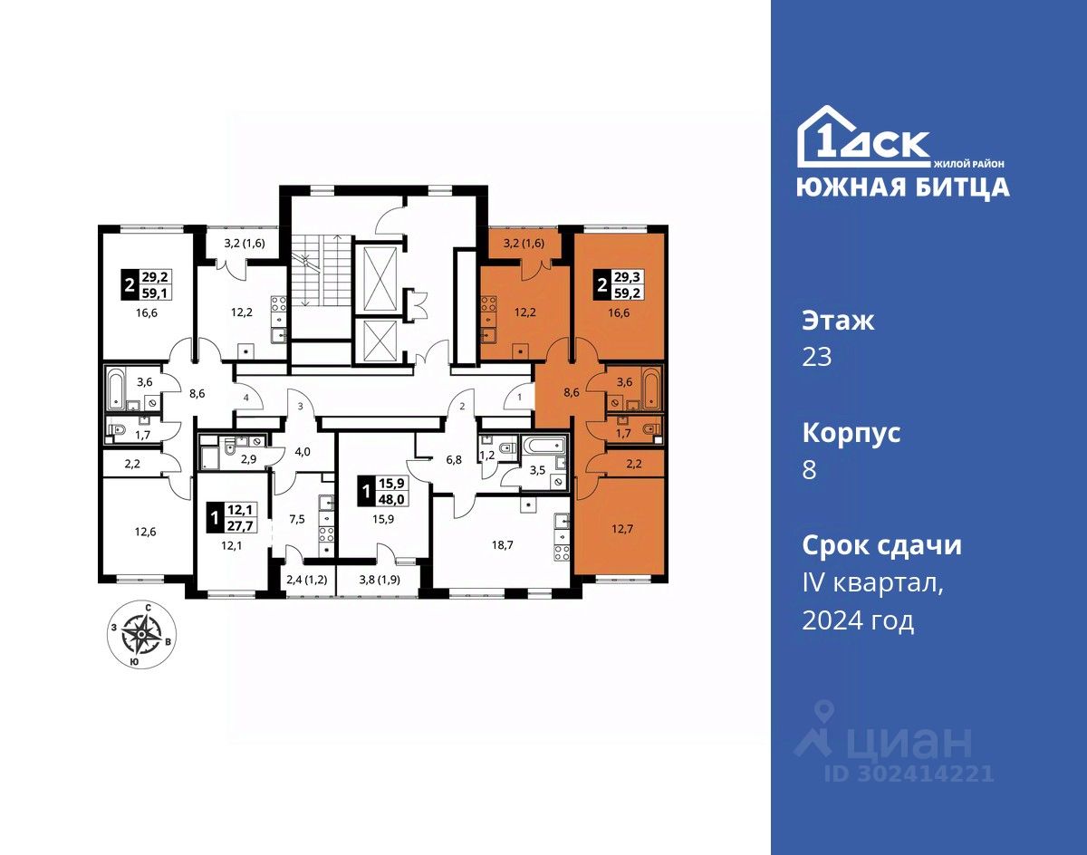 До конца апреля скидки на квартиры до 25%! От 45 500 руб/месяц за готовые квартиры. Максимальные скидки при 100% оплате. Корпус сдан! Прямая продажа от застройщика! Семейный жилой район класса Комфорт Плюс Продаётся 2-к квартира номер 505 в сданном корпусе общей площадью 59.4 кв.м на 23-м этаже 23 этажного дома.