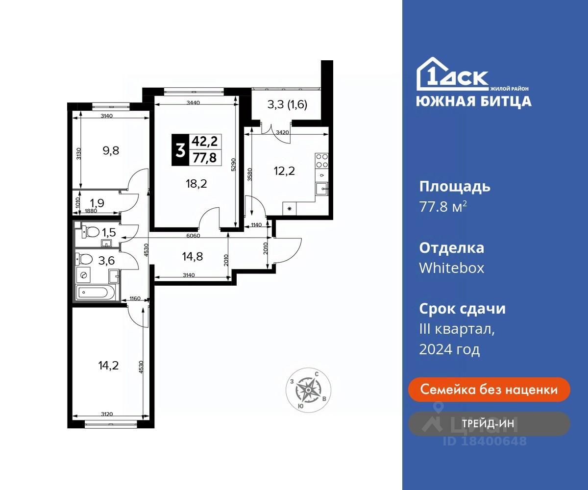 Максимальные скидки при 100% оплате. Ипотека для всех! Своя квартира от 69 300 руб/мес Корпус сдан! Прямая продажа от застройщика! Семейный жилой район класса Комфорт Плюс Продаётся 3-к квартира номер 248 в сданном корпусе общей площадью 77.8 кв.м на 17-м этаже 24 этажного дома.