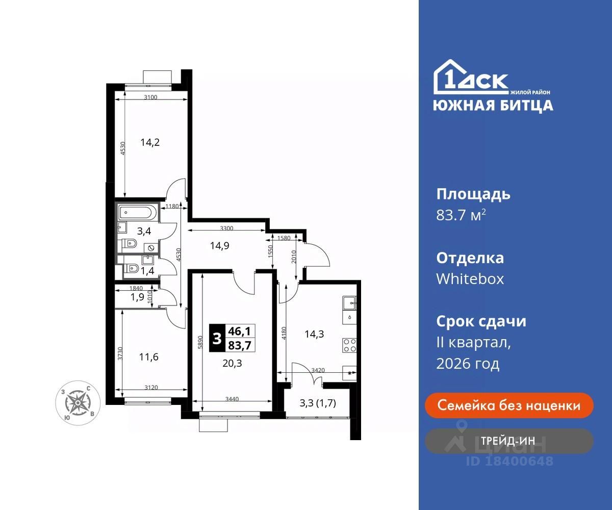 Максимальные скидки при 100% оплате. Ипотека для всех! Своя квартира от 69 300 руб/мес Прямая продажа от застройщика! Семейный жилой район класса Комфорт Плюс Продаётся 3-к квартира номер 325 общей площадью 83.7 кв.м на 18-м этаже 22 этажного дома. Отделка Whitebox.