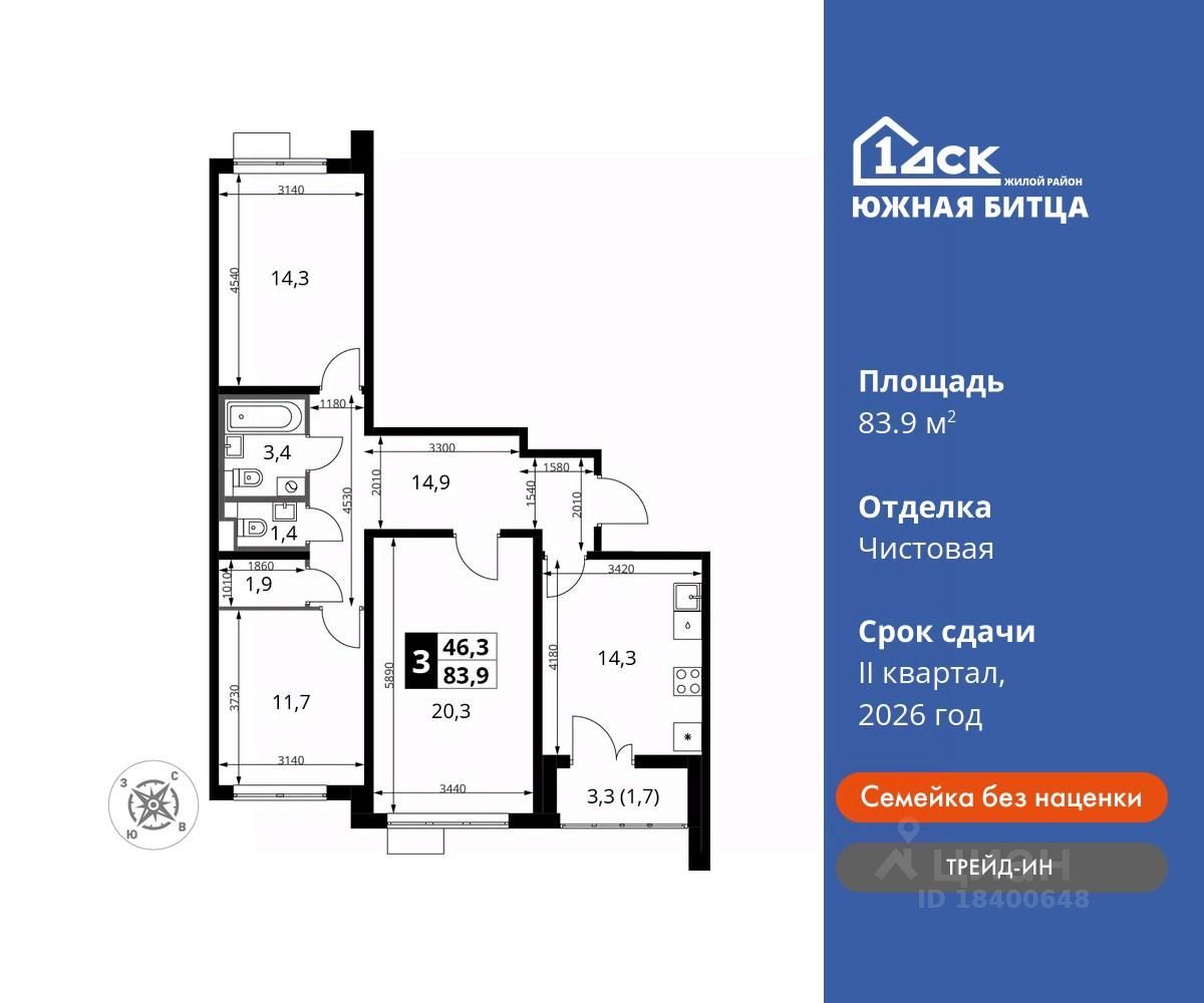 Максимальные скидки при 100% оплате. Ипотека для всех! Своя квартира от 69 300 руб/мес Прямая продажа от застройщика! Семейный жилой район класса Комфорт Плюс Продаётся 3-к квартира номер 421 общей площадью 83.9 кв.м на 20-м этаже 22 этажного дома. Чистовая отделка.