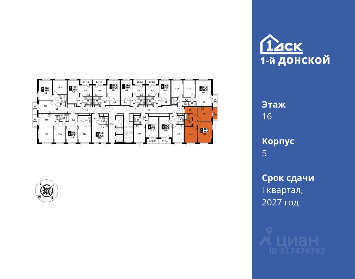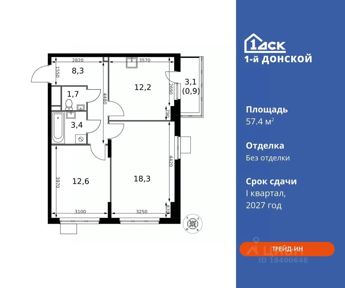 Общая площадь57,4 м2