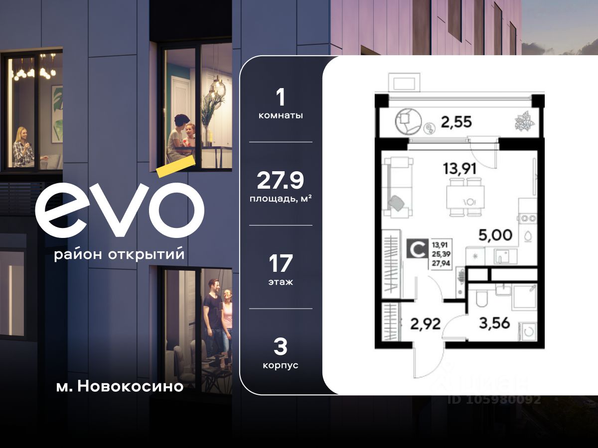 Продается студия 27.94 кв.м. в жилом комплексе EVO на 17 этаже по адресу: Московская область, г. Реутов, ул. Комсомольская. Скидка 10% на пул квартир!* EVO - проект комфорт-класса от девелопера Dogma. Каждый житель сможет открыть для себя максимум возможностей. Совершенствоваться во всех направлениях: физическом, эмоциональном и материальном. В EVO можно открыть для себя новые виды спорта, найти единомышленников по хобби, партнеров по бизнесу, развивать в детях новые грани, наслаждаться природой и лаконичной архитектурой.